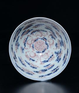 Coppetta in porcellana con decoro rosso ferro sotto coperta con numerosi simboli buddisti, Cina, Dinastia Qing, marca e [..]