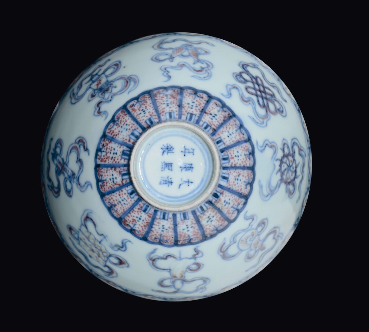 Coppetta in porcellana con decoro rosso ferro sotto coperta con numerosi simboli buddisti, Cina, Dinastia Qing, marca e del periodo Kangxi (1662-1722)