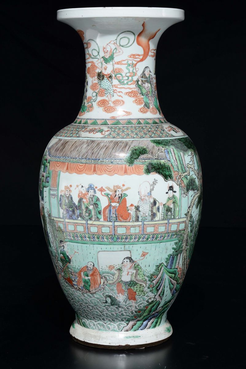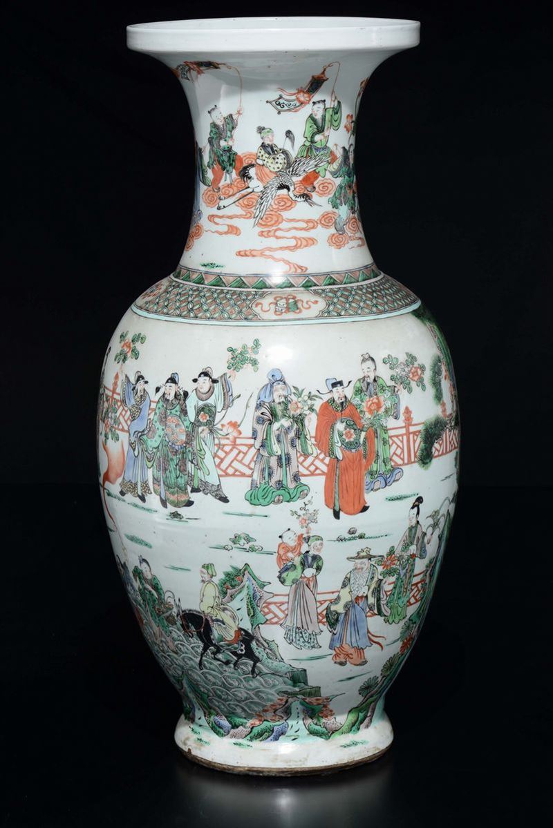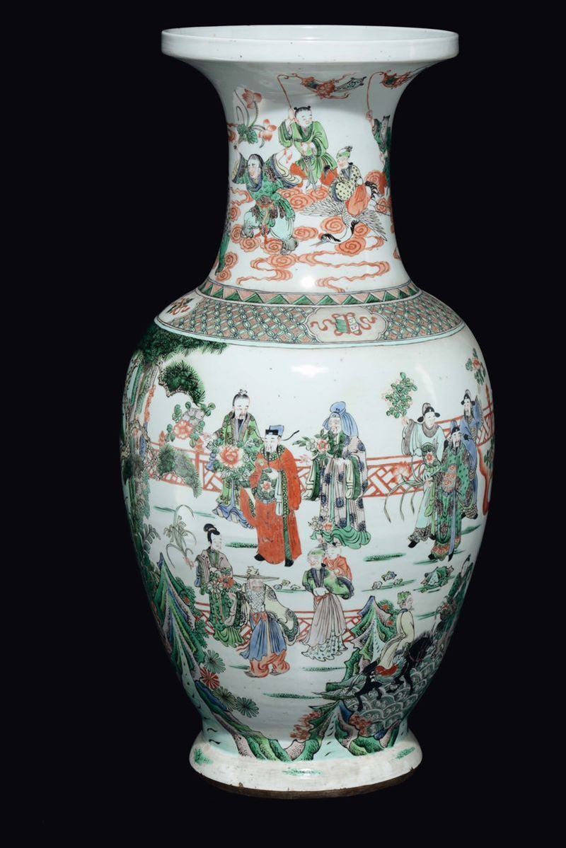 Coppia di vasi in porcellana Famiglia Verde con raffigurazione di scene di vita di corte sul corpo mentre sui colli saggi tra le nuvole, Cina, Dinastia Qing, XIX secolo