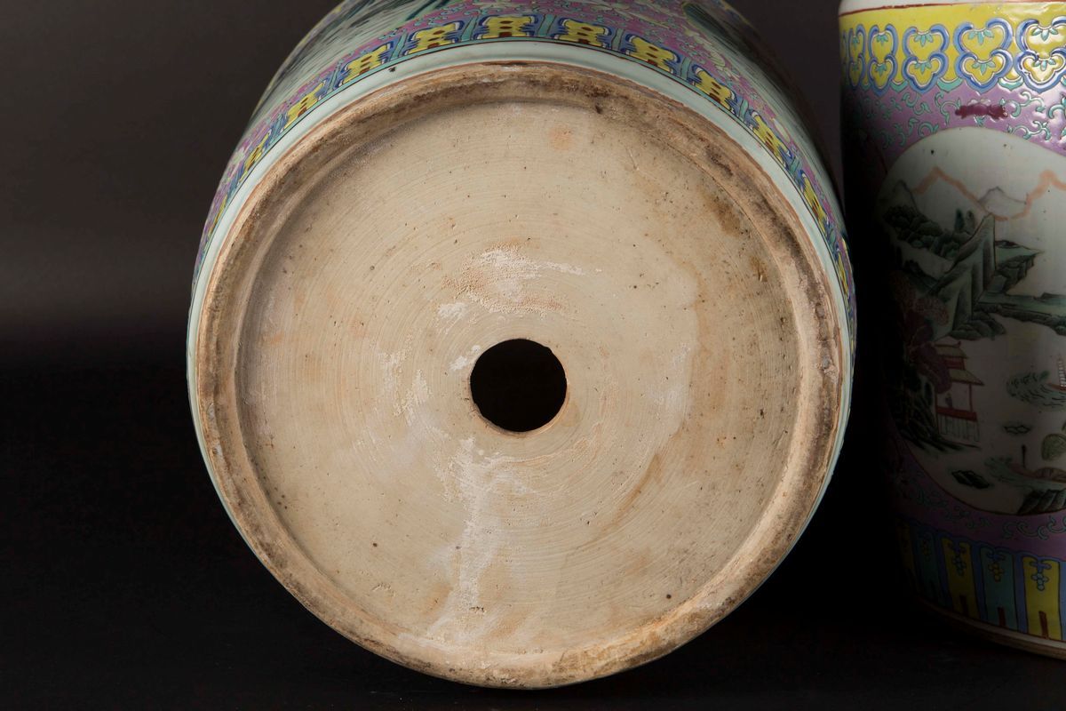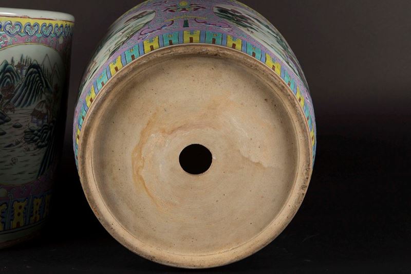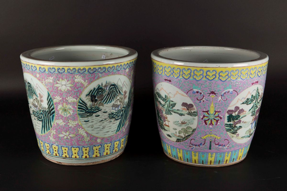 Due cachepot in porcellana Famiglia Rosa con paesaggi fluviali entro riserve, Cina, Dinastia Qing, XIX secolo