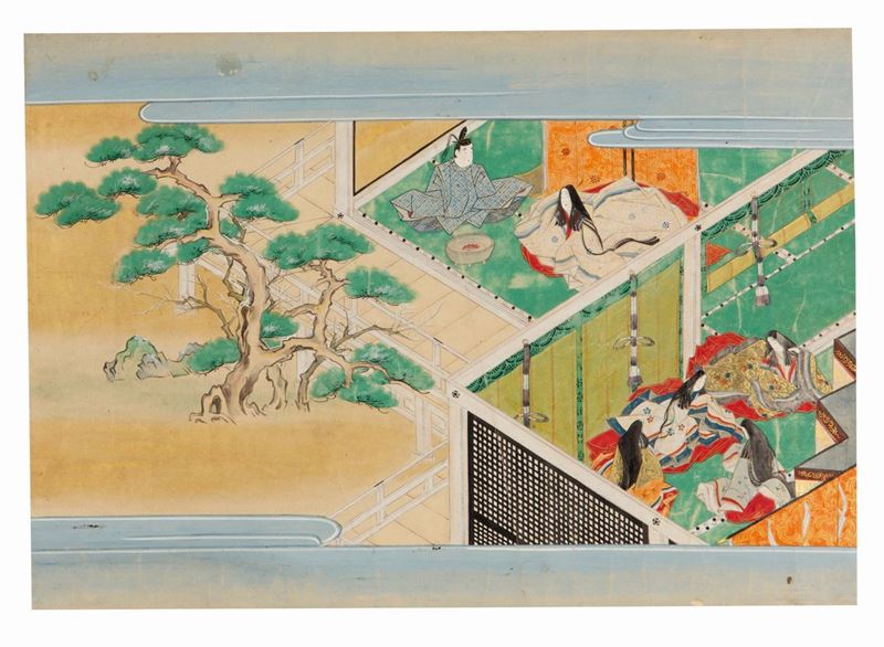 Due dipinti a fondo oro raffiguranti dignitari ed iscrizioni, Giappone, fine XVII secolo