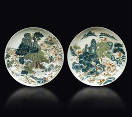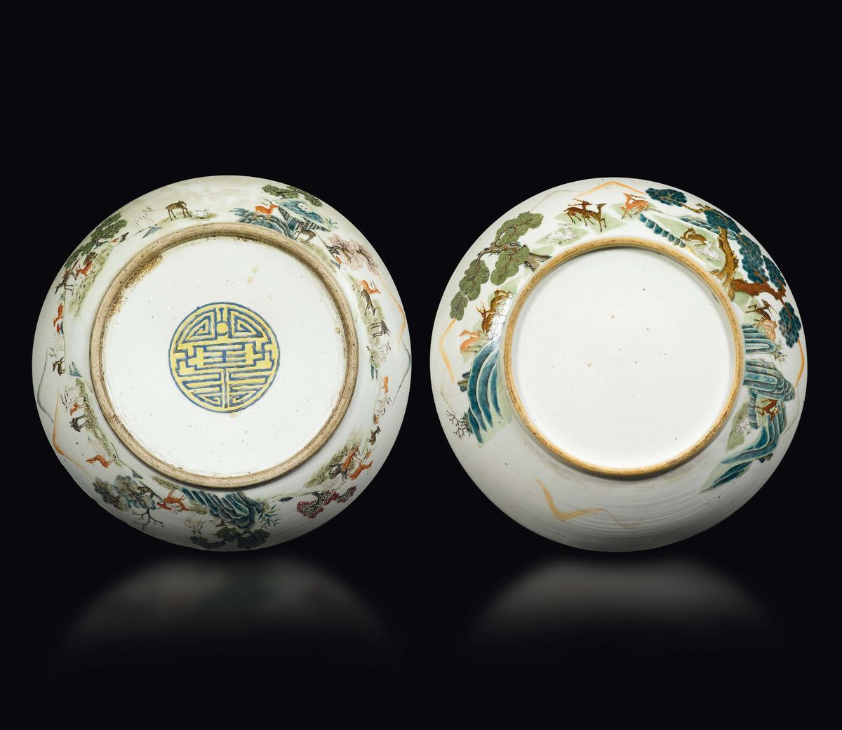 Due grandi piatti in porcellana a smalti policromi con decoro a cento cervi, Cina, Dinastia Qing, XIX secolo