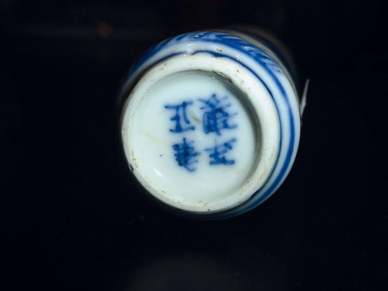 Due snuff bottle in porcellana bianca e blu raffiguranti paesaggi fluviali con pescatori, Cina, Dinastia Qing, XIX secolo [..]