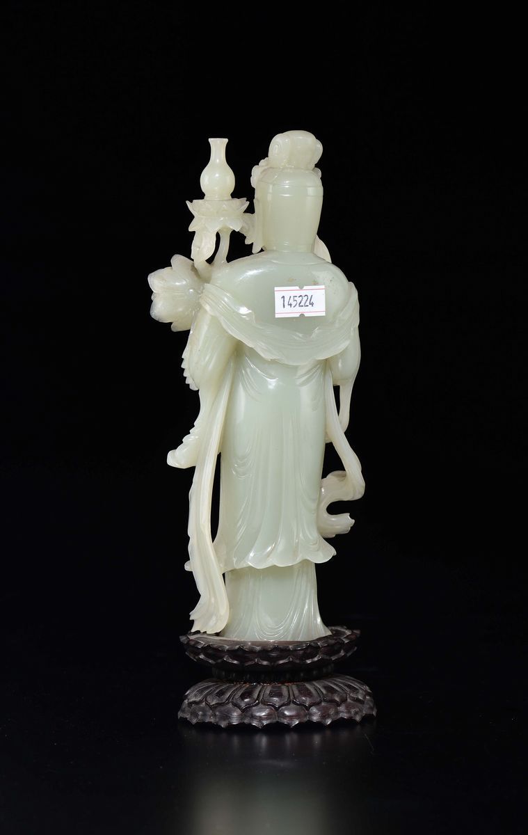Figura di Buddha in giada bianca con fiore e vaso sorretto da fiore di loto, Cina, XX secolo