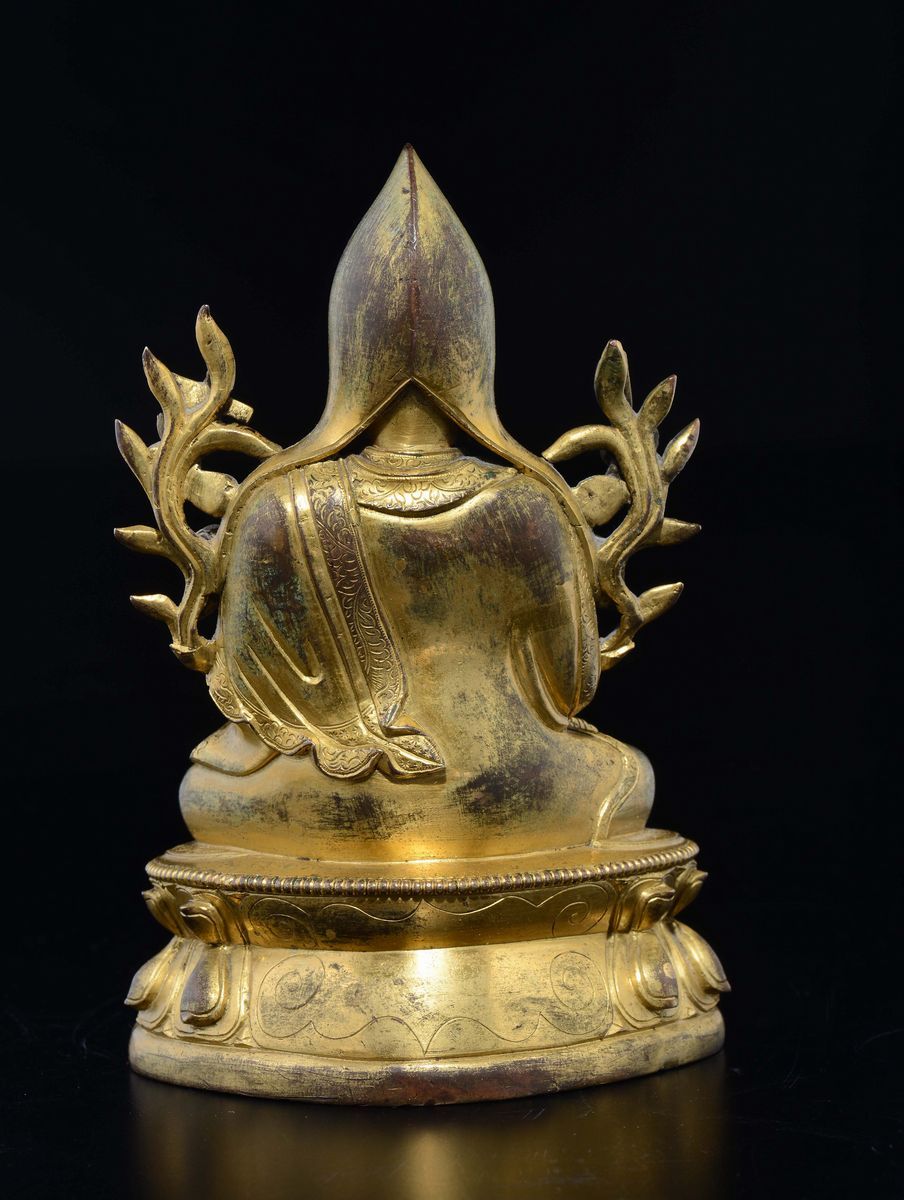Figura di Dalai Lama Kusali in bronzo dorato seduto su doppio fiore di loto, Tibet, XVIII secolo