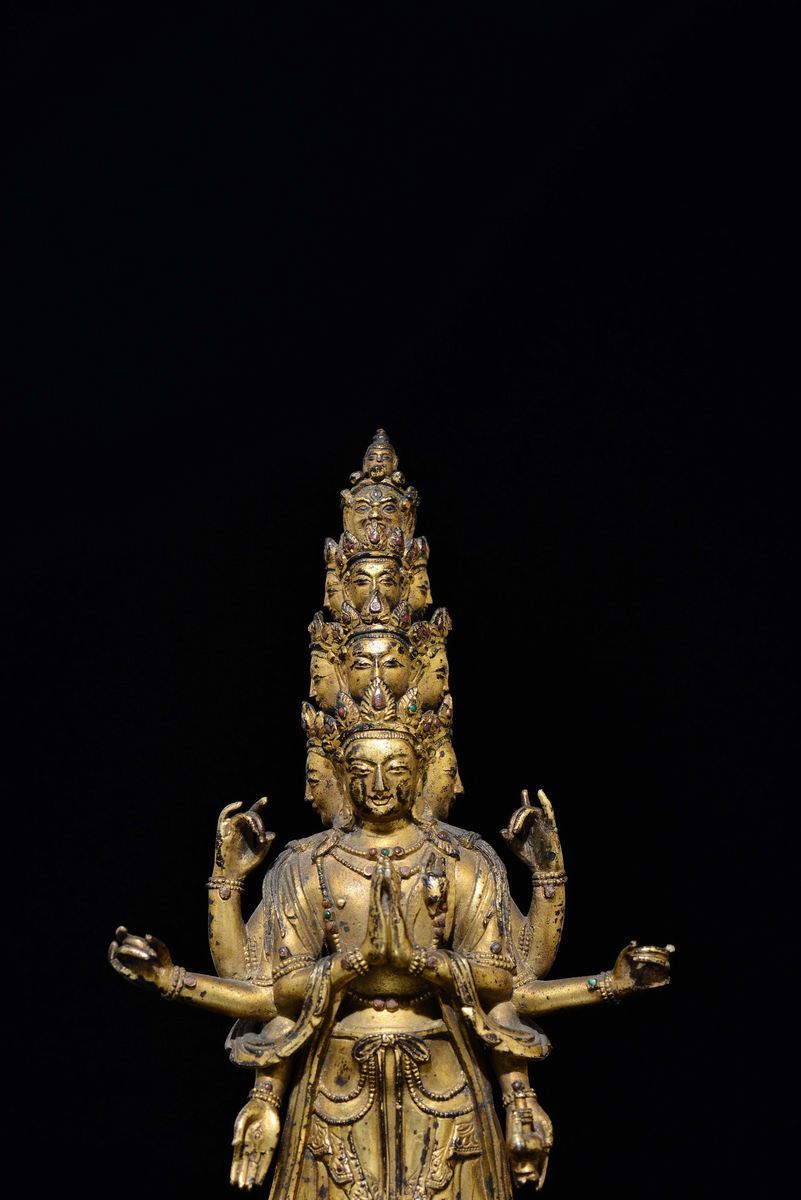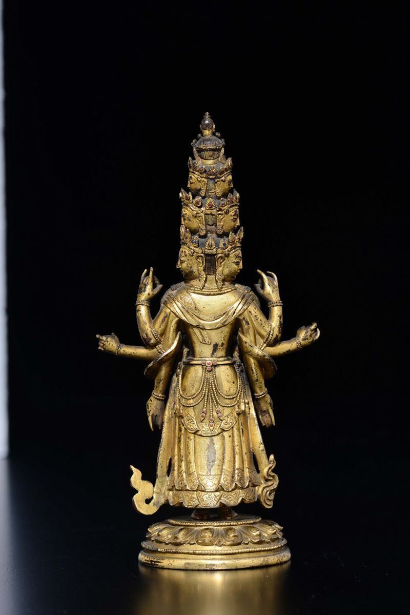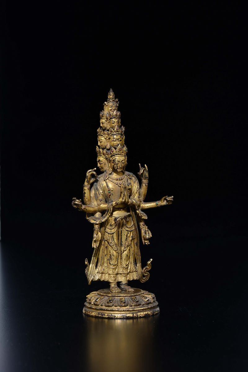 Figura di Ekadasamukha-Avalokitesvara in bronzo dorato eretto su fiore di loto, Tibet, XVIII secolo