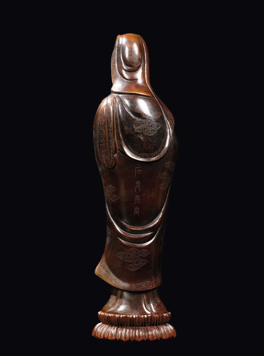 Figura di Guanyin con velo sulla testa scolpita in bronzo con decoro in argento di nuvole, Cina, Dinastia Qing, epoca Jiaqing, [..]