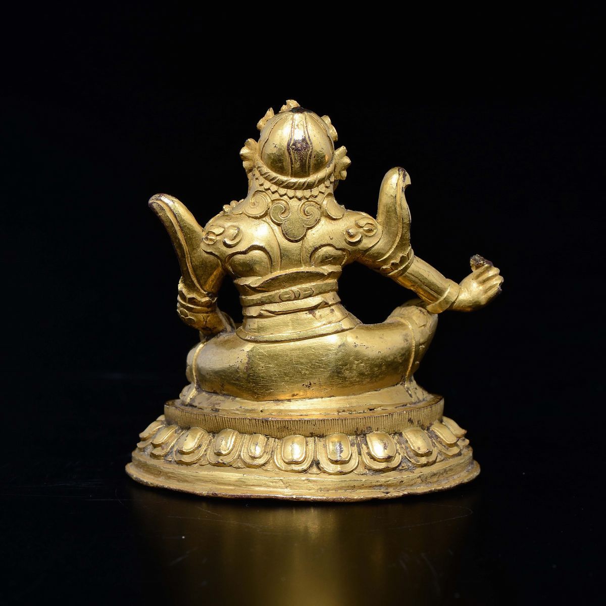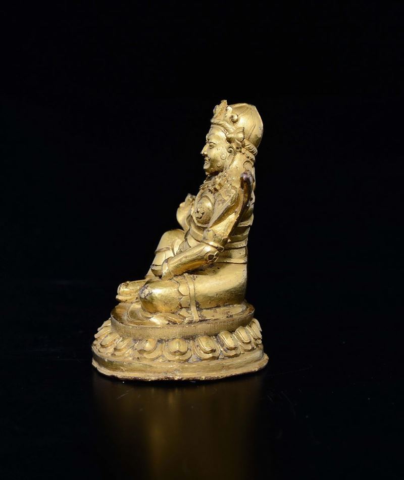 Figura di guerriero Yaksha in bronzo dorato seduto su fiore di loto, Cina, Dinastia Ming, XVI secolo