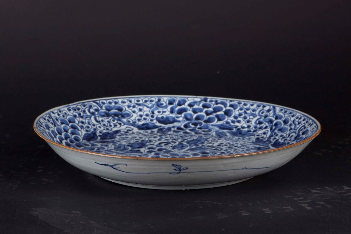 Grande piatto in porcellana bianca e blu raffigurante grappoli d’uva, Cina, Dinastia Qing, epoca Kangxi (1662-1722)