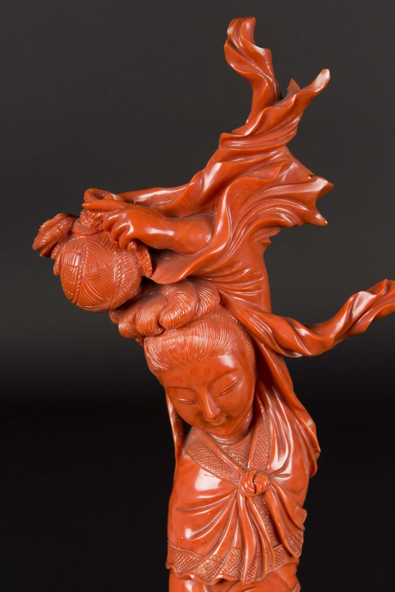 Grande scultura scolpita in corallo raffigurante Guanyin con fanciullo, Cina, Dinastia Qing, fine XIX secolo