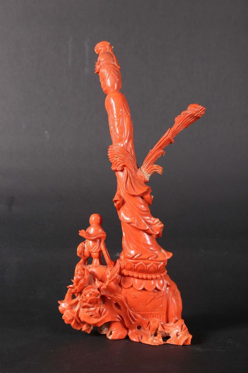 Gruppo in corallo raffigurante Guanyin su elefante con fanciulli, Cina, Dinastia Qing, fine XIX secolo