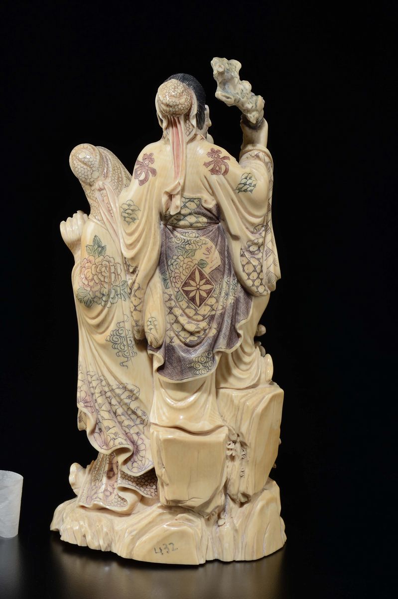 Gruppo scolpito in avorio dipinto raffigurante due saggi con rami di rose a rilievo, Cina, inizio XX secolo