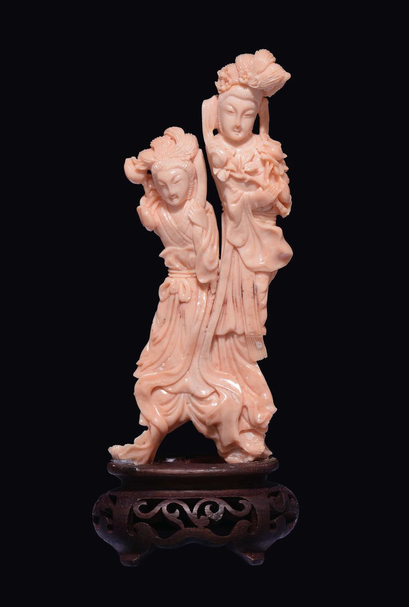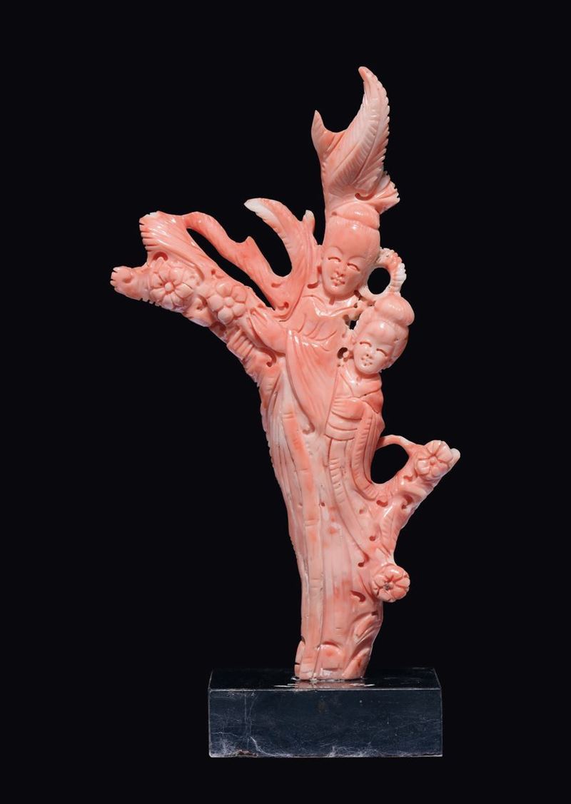 Lotto di tre coralli, due rosa ed uno bianco, raffiguranti Guanyin, Cina, inizio XX secolo