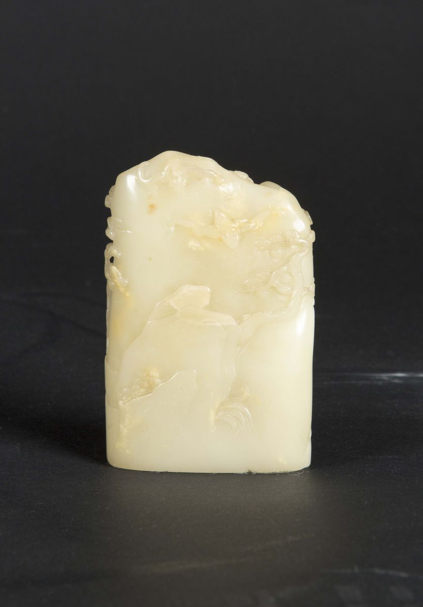 Montagna in giada bianca con pipistrelli e capre a rilievo, Cina, Dinastia Qing, XIX secolo