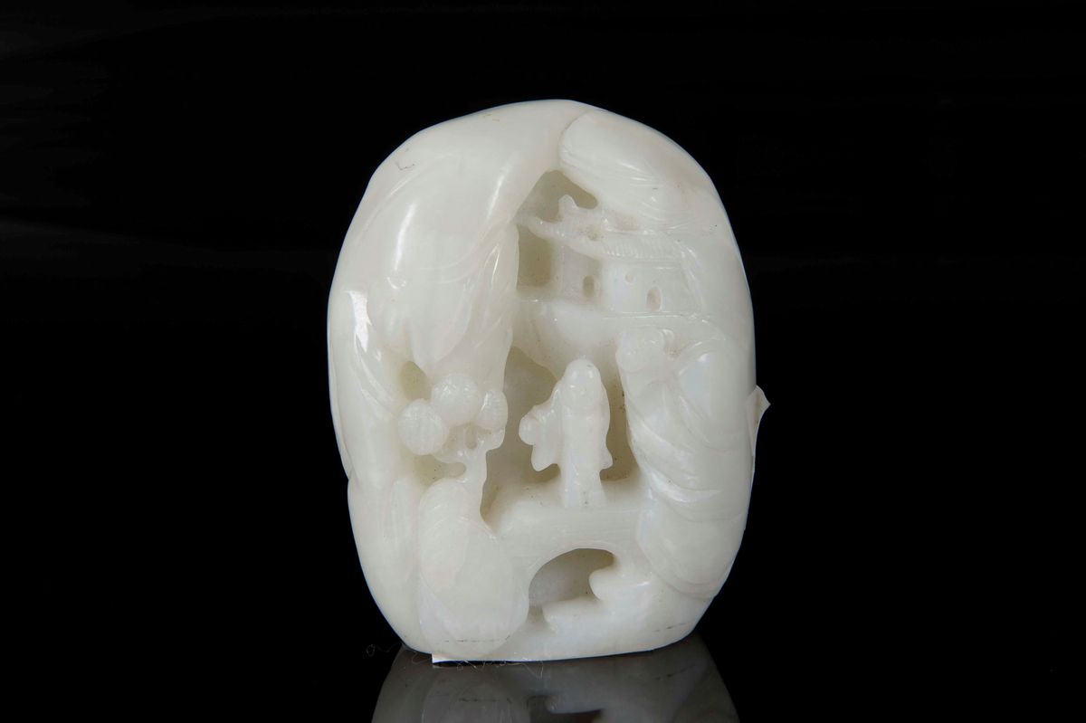 Montagna scolpita in giada bianca con raffigurazioni di personaggi e divinità, Cina, XX secolo