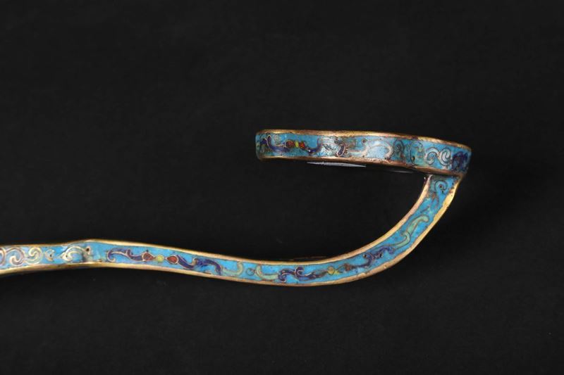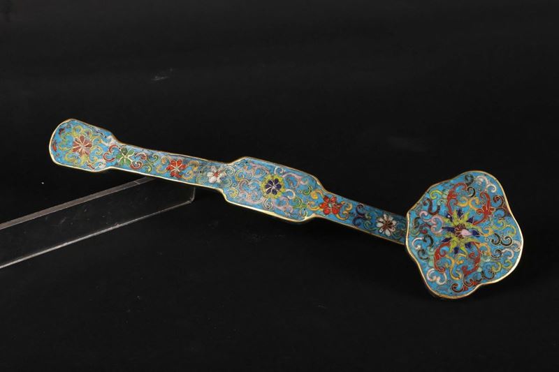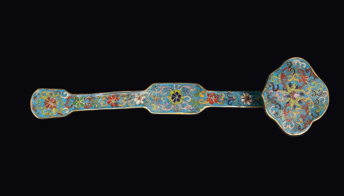 Ruyi in bronzo dorato e con smalti cloisonné a decoro floreale, Cina, Dinastia Qing, epoca Qianlong (1736-1795)