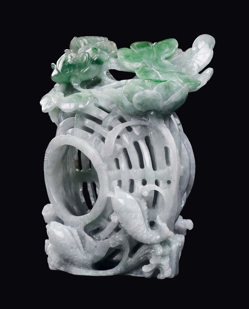 Sciacquapennelli in giadeite con decoro vegetale e pesci a rilievo, Cina, XX secolo