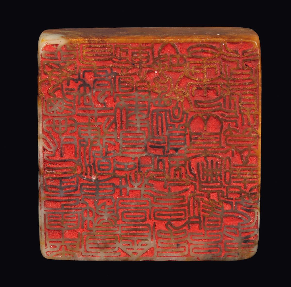 Sigillo di forma quadrata in giada bianca e russet, Cina, Dinastia Qing, XIX secolo