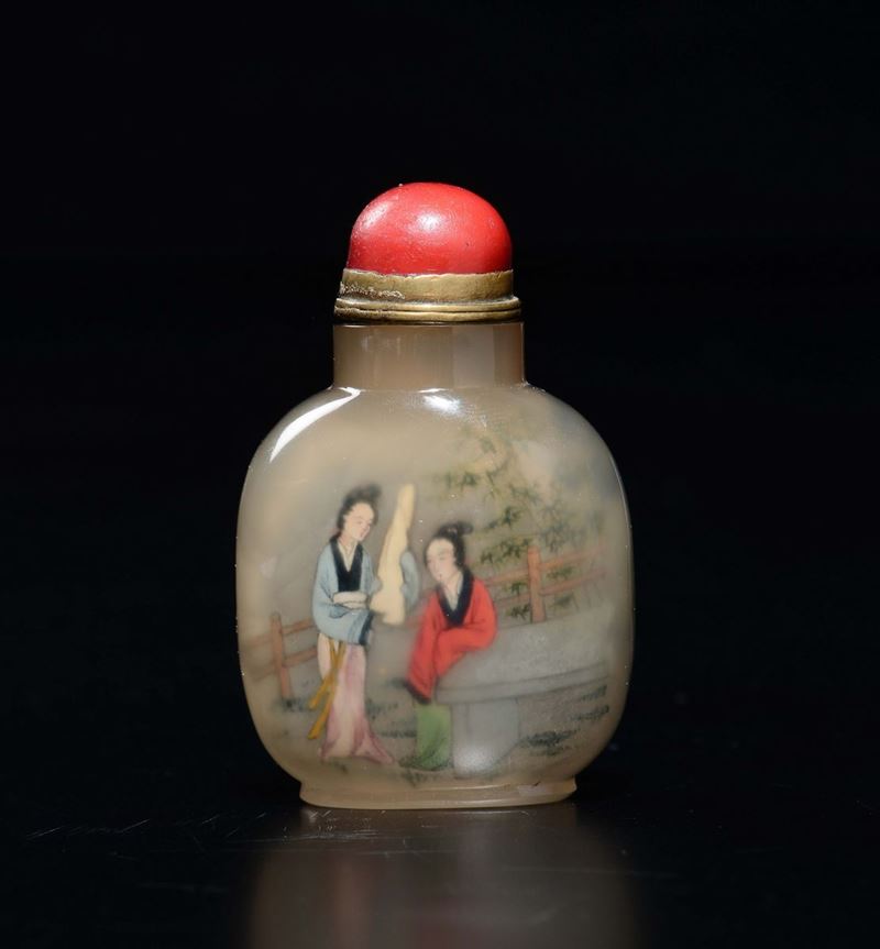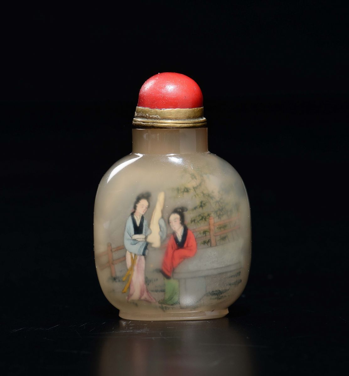 Snuff bottle in agata dipinta con personaggi, firmata, Cina, Dinastia Qing, XIX secolo