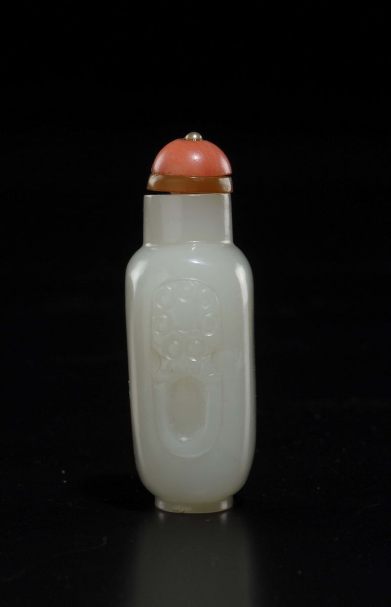 Snuff bottle in giada bianca con piccoli manici, Cina, Dinastia Qing, XVIII secolo