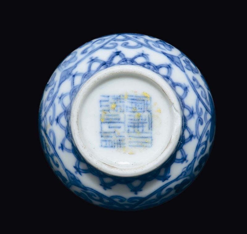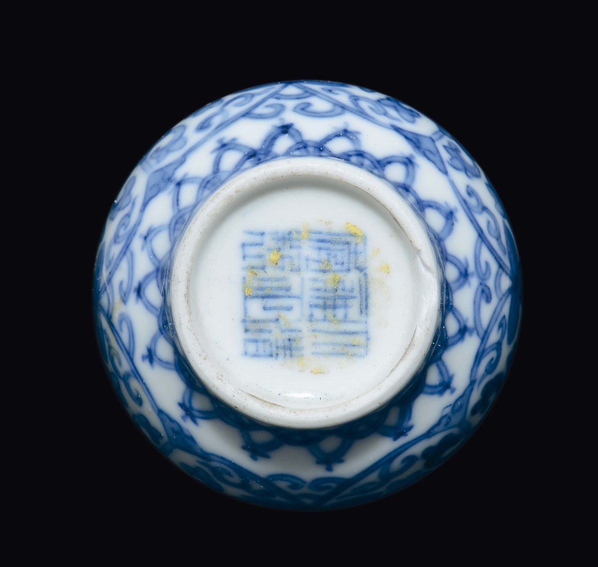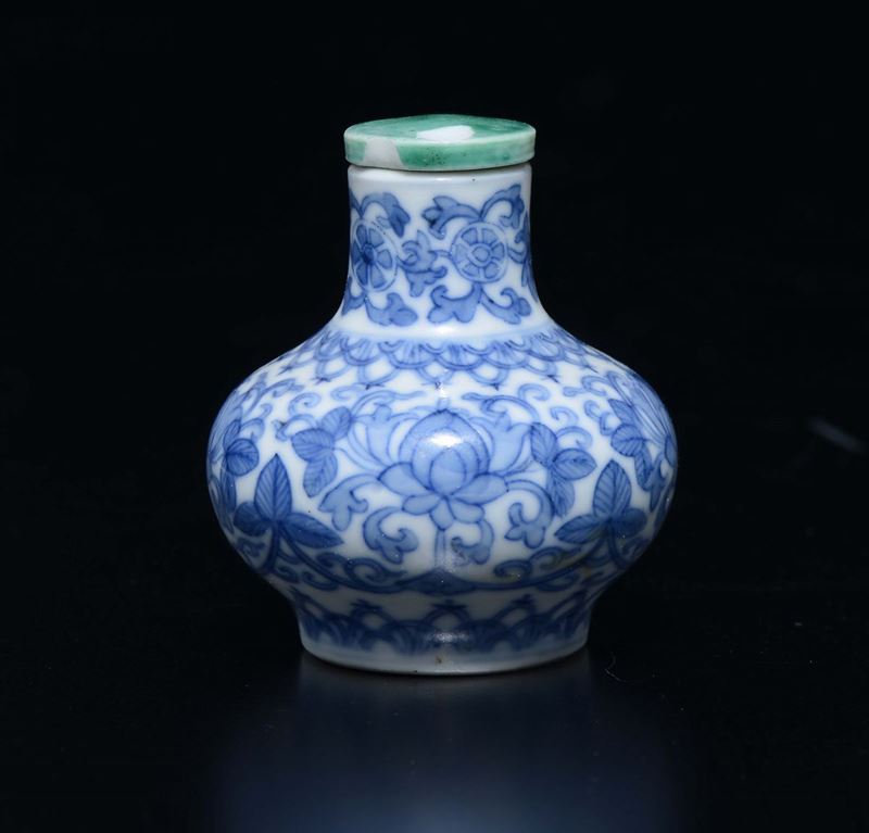 Snuff bottle in porcellana bianca e blu con decoro di fiori di loto, Cina, Dinastia Qing, XIX secolo
