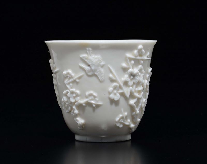 Tazza da libagione in porcellana Blanc de Chine Dehua con decoro di fiori di ciliegio a rilievo, Cina, Dinastia Ming, fine XVII secolo