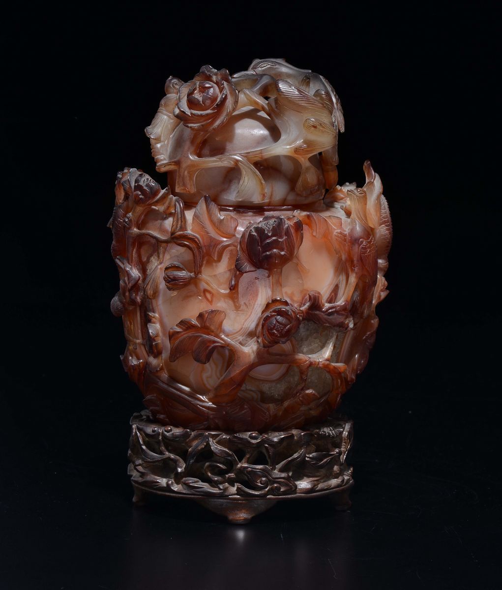 Vaso con coperchio in agata con decoro di gru e rami a rilievo, Cina, Dinastia Qing, XIX secolo
