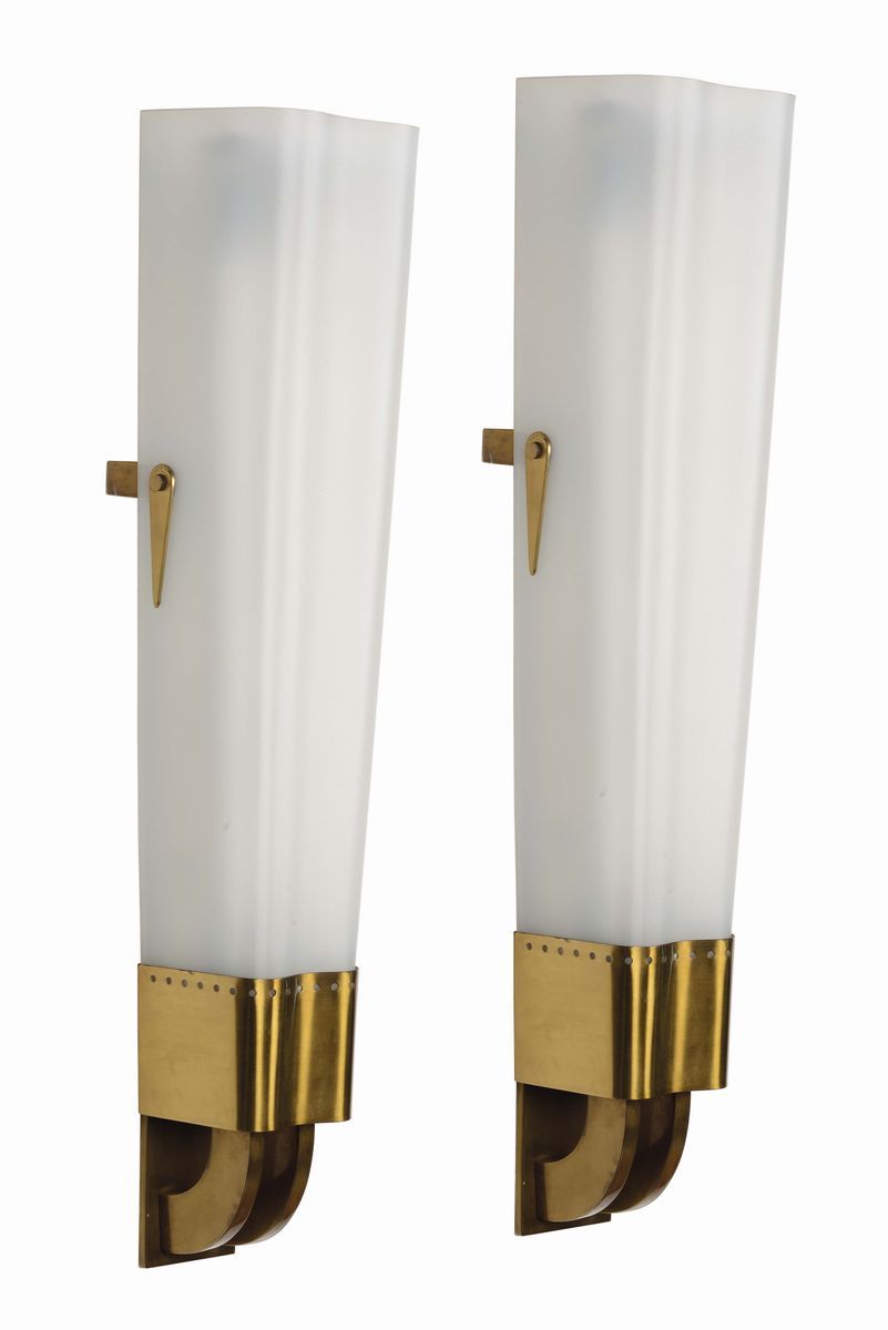 Coppia di appliques in ottone con diffusore in policarbonato opalino. Etichetta originale.Prod. Greco, Italia, 1955cm 87