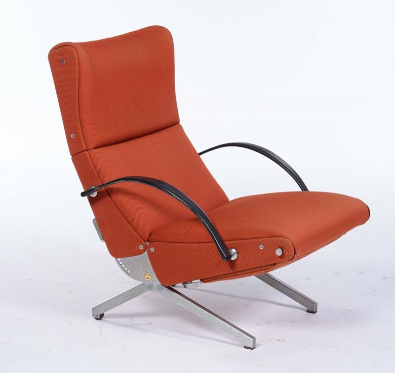 Poltrona P40 con struttura in acciaio, base in metallo verniciato e rivestimento in tessuto.Prod. Tecno, Italia, 1955cm 75x95x115