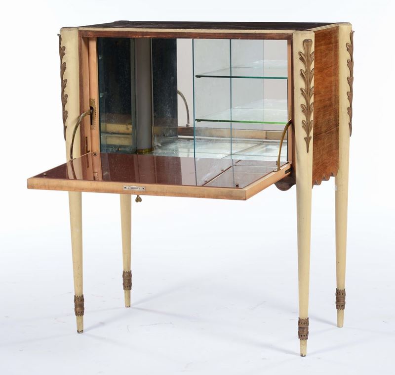 Mobile Bar con struttura in legno verniciato, dettagli in ottone e rivestimento in vetro specchiato.Prod. Italia, 1940 ca.cm 97x49x114