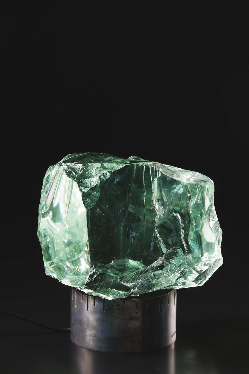 Lampada da tavolo composta da grosso blocco in vetro scalpellato e base in metallo.Prod. Saint Gobain, Italia, 1960 ca.cm 20x25x15