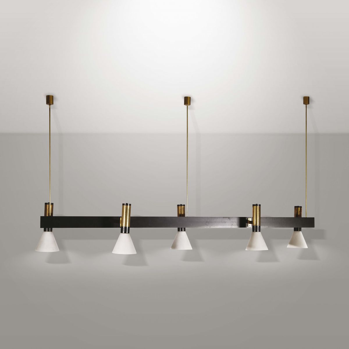 Lampada da sospensione in metallo verniciato e vetro satinato.Prod. Stilnovo, Italia, 1950 ca.cm 270x123x54