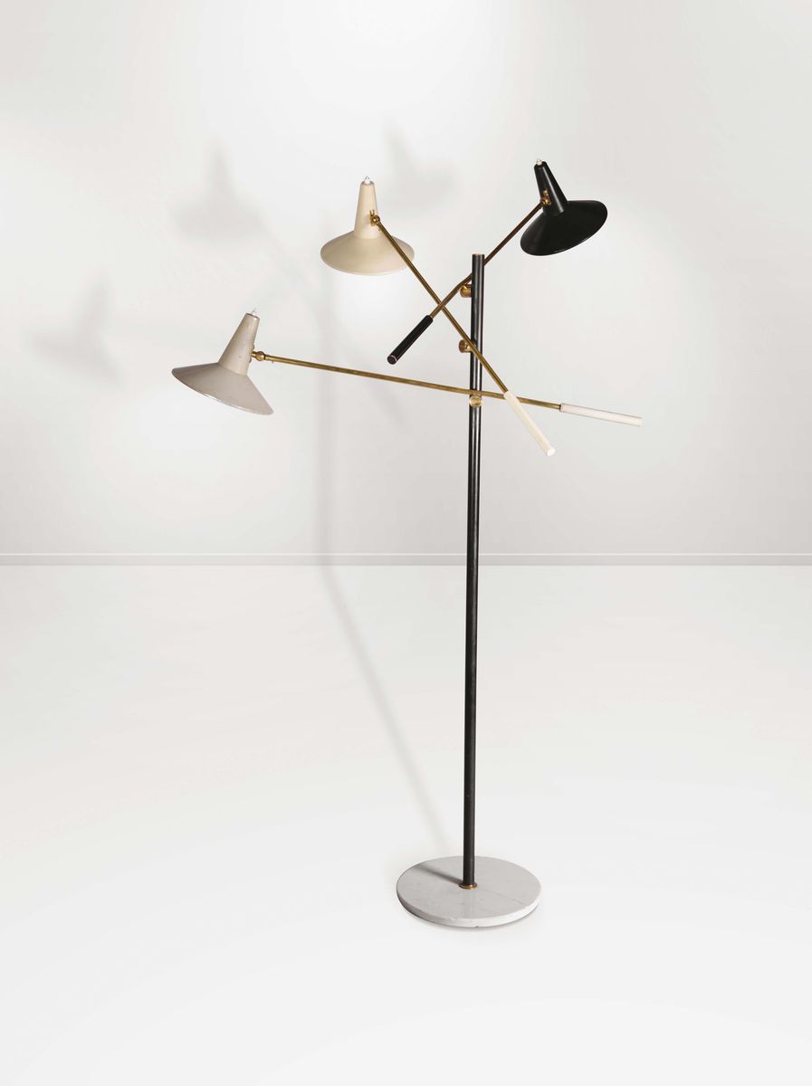 Lampada da terra in ottone, metallo laccato con base in marmo. Marchio incusso.Prod. Stilnovo, Italia, 1950 ca.cm 115x215