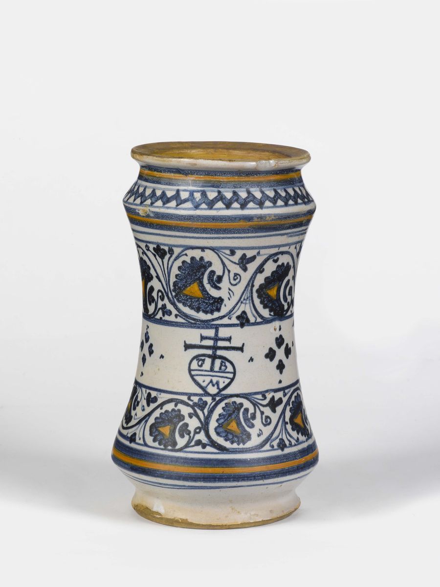 Maiolica a gran fuoco in policromia, altezza cm 18,5Piccoli felature e sbeccature restaurateCorpo cilindrico fortemente rastremato, base piatta, bocca circolare leggermente estroflessa.Vaso simile al precedente con decorazione composta di fasce orizzontali con motivi geometrici e floreali tralcio corrente di foglie cuoriformi e minuti motivi vegetali di gusto ispano-moresco. Nella fascia centrale sono ospitate l’inscrizione farmaceutica:“DIA. DIA. RODION “ e un’insegna (di confraternita o della farmacia) ), composta dalle iniziali “G. B/M” entro scudo sormontato da doppia croce. Sulla spalla motivo a treccia stilizzata.