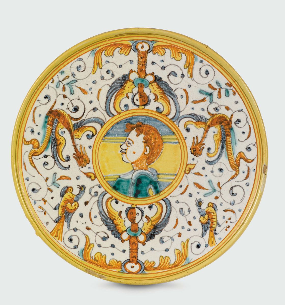 Maiolica a gran fuoco in policromia, altezza cm 6,0; diametro cm 21,0 Buono stato di conservazioneCorpo circolare su alto piede, base circolare incavata.Al centro è dipinto un medaglione che racchiuse il busto di un giovane, volto a sinistra. Sulla restante superficie, simmetrica decorazione “a raffaellesche”.