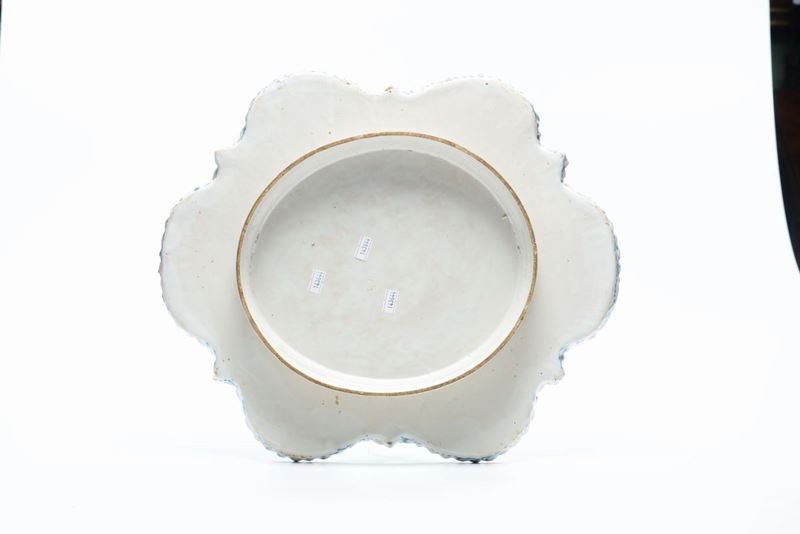 Maiolica a gran fuoco in policromia, dimensioni cm 42,5x36,0Lievi sbeccatureCorpo ad orlo mistilineo, lobato e cuspidato, con una lieve cordonatura al bordo. Base ad anello rialzato.Decorazione alla “Rouen” che dal bordo converge a raggiera verso la composizione centrale. I gruppi fogliati presentano fragoline al posto dei fiori.