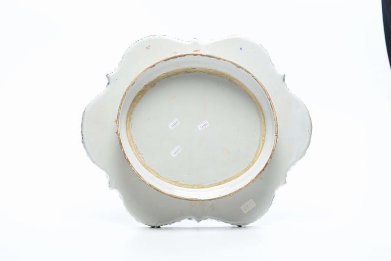 Maiolica a gran fuoco in policromia, dimensioni cm 40,0x43,0Lievi sbeccature, danno ad un piedeCorpo ad orlo mistilineo, lobato e cuspidato, con una lieve cordonatura al bordo. Base ad anello rialzato.Decorazione con grande fascia di fiori a mazzetto e tralci fogliati. L’ornato floreale circonda un cespuglio fiorito.