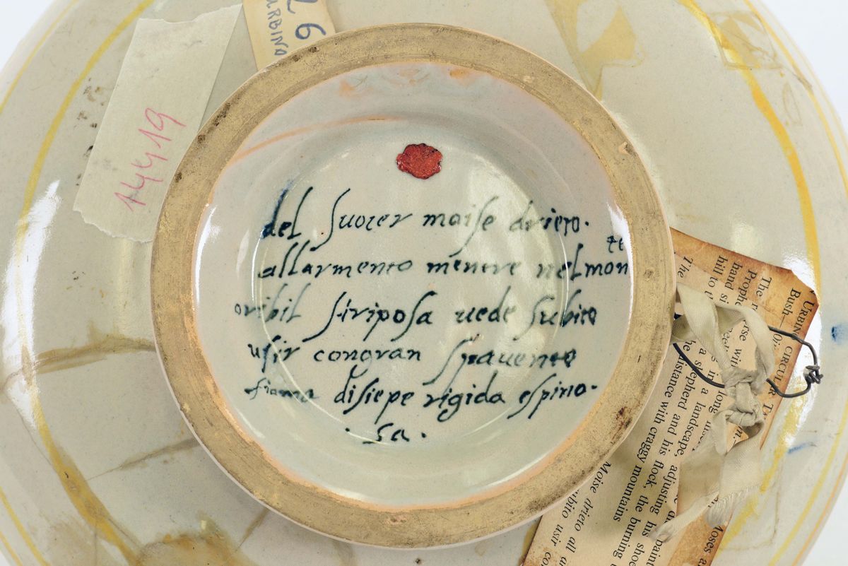 Maiolica a gran fuoco in maiolica policroma, altezza cm 6,0; diametro cm 25,4Rotture visibiliCorpo concavo basso piede incavato. L’iconografia raffigura, come inscritto al verso all’interno del piede, “Del suocer Moise drieto all armento menere nel monte ovibil si riposa vede subito usir con gran spavento fiama di siepe rigida espinosa”.