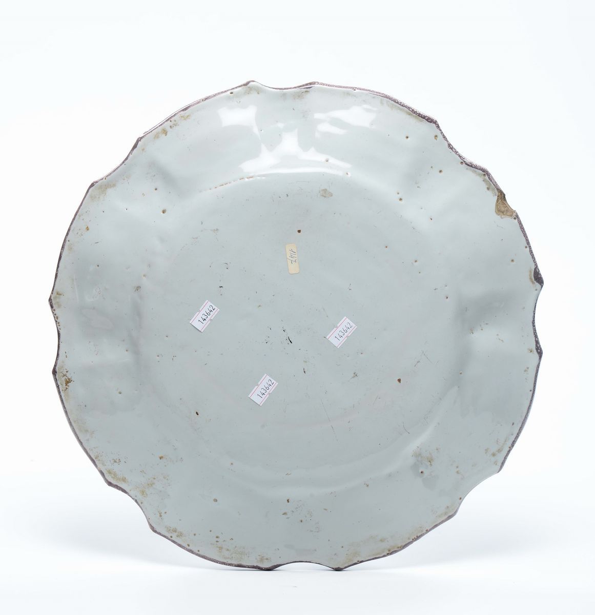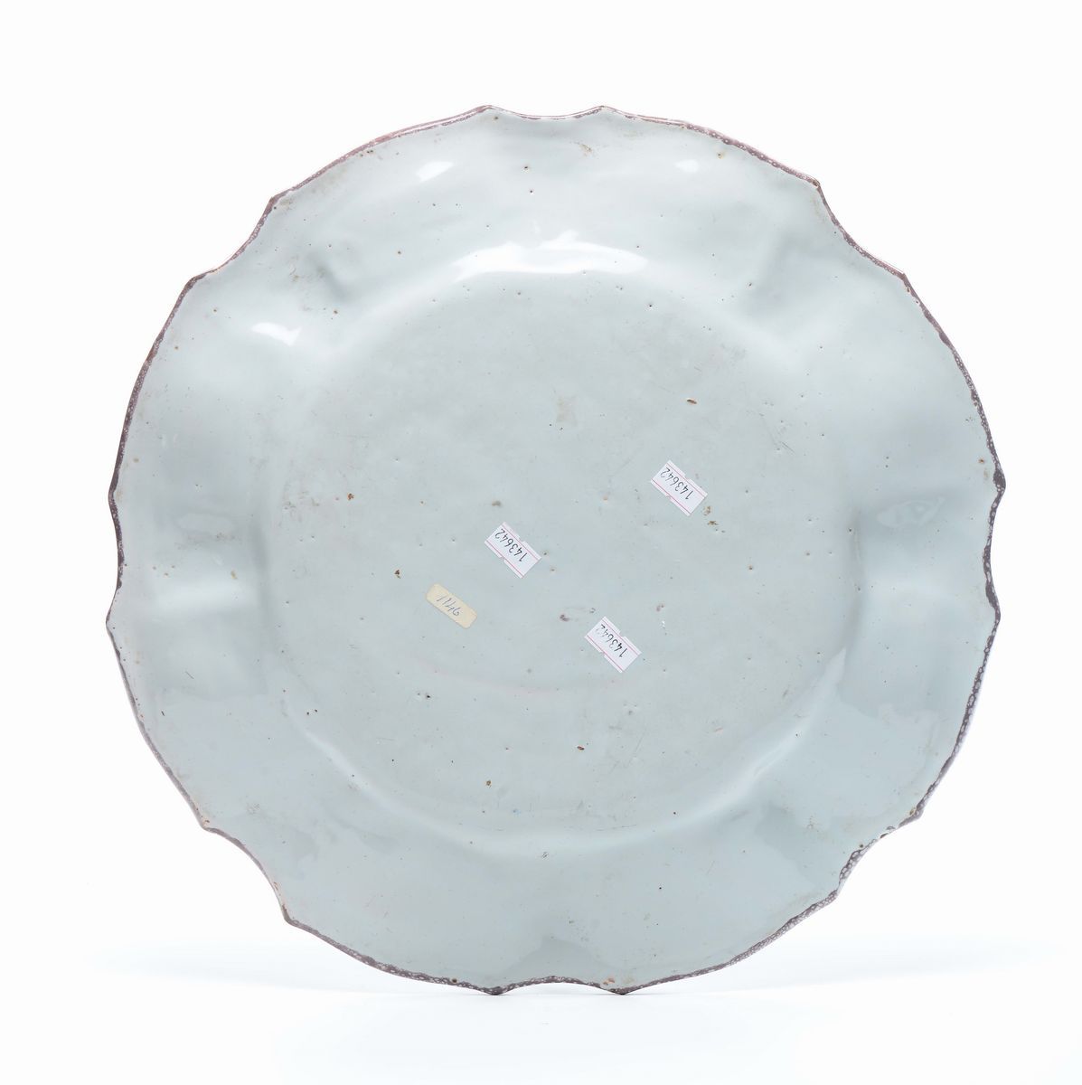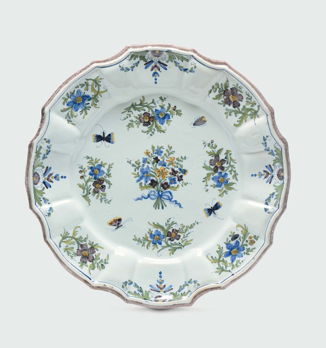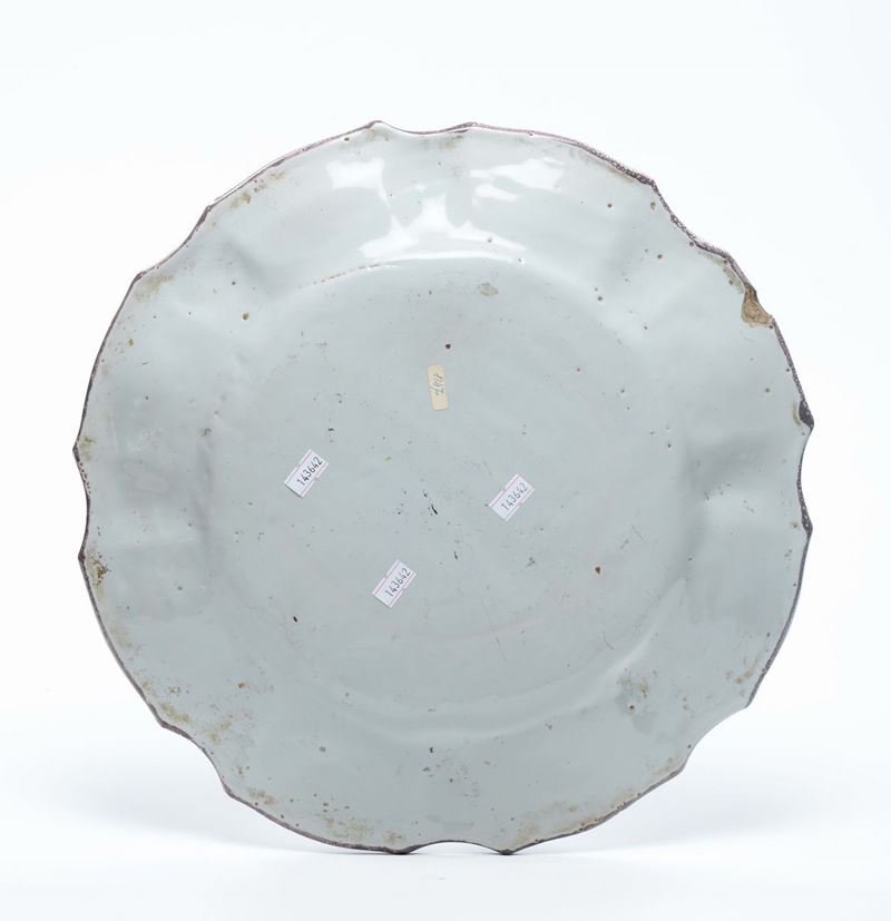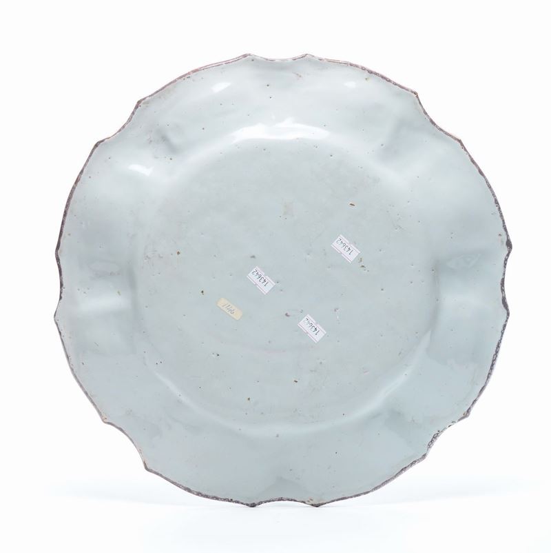 Maiolica a gran fuoco in policromia, diametro cm 37,5Corpo circolare, apodo, con ampio cavetto e tesa sbaccellata, orlo sagomato.Nel cavetto la decorazione comprende un mazzetto di fiori vari legato da un nastro, attorno mazzetti di anemoni ed insetti equidistanti fra loro ed alternati. Lungo la tesa, si dispone una decorazione composta di rametti fogliati con anemone alternati da semicorolle con tralci uncinati.
