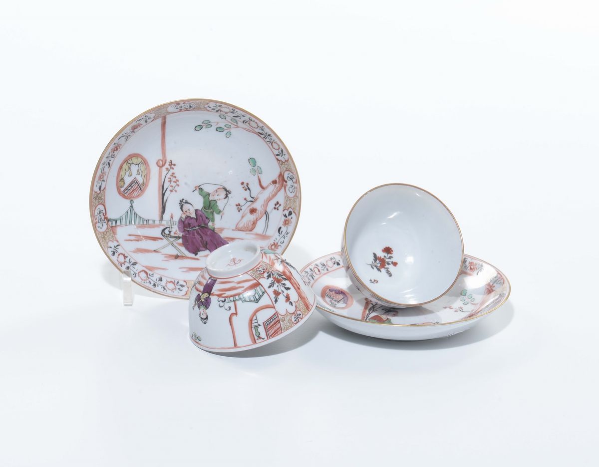 Porcellana, Marca ancora in rosso, tazza: altezza cm 4,0; piattino: diametro cm 12,0Minima sbeccatura su un bordo di un piattinoTazzine con piattino, decorazione policroma a “quartieri” con figure di cinesini in atteggiamento di svago in giardini.