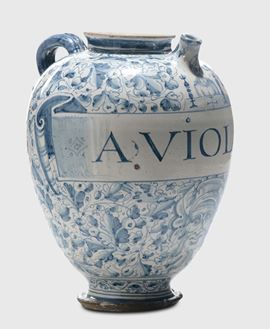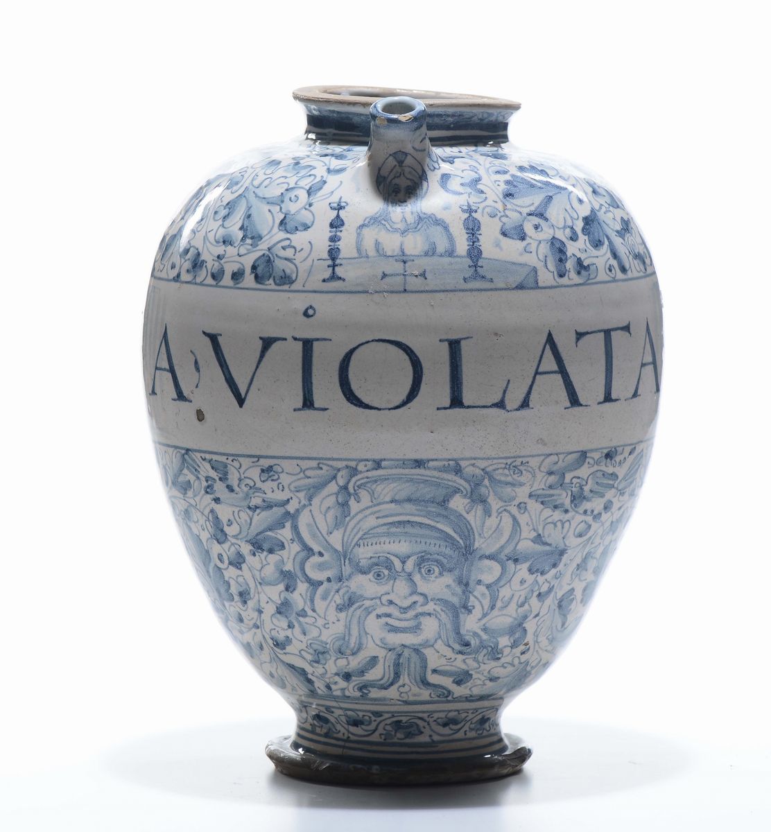 Maiolica a gran fuoco in monocromia, altezza cm 34,5Sbeccature alla baseCorpo ovoidale, basso piede svasato, bocca rastremata estroflessa. Pipiolo cilindrico. Ansa ad orecchio con tortiglioni e sottostante mascherone a rilievo.Decorazione con “foglie partite” bacche e uccelli. Cartiglio con iscrizione farmaceutica “ A. VIOLATA”, con sottostante mascherone e sovrastante figura di Cristo a mezzo busto.