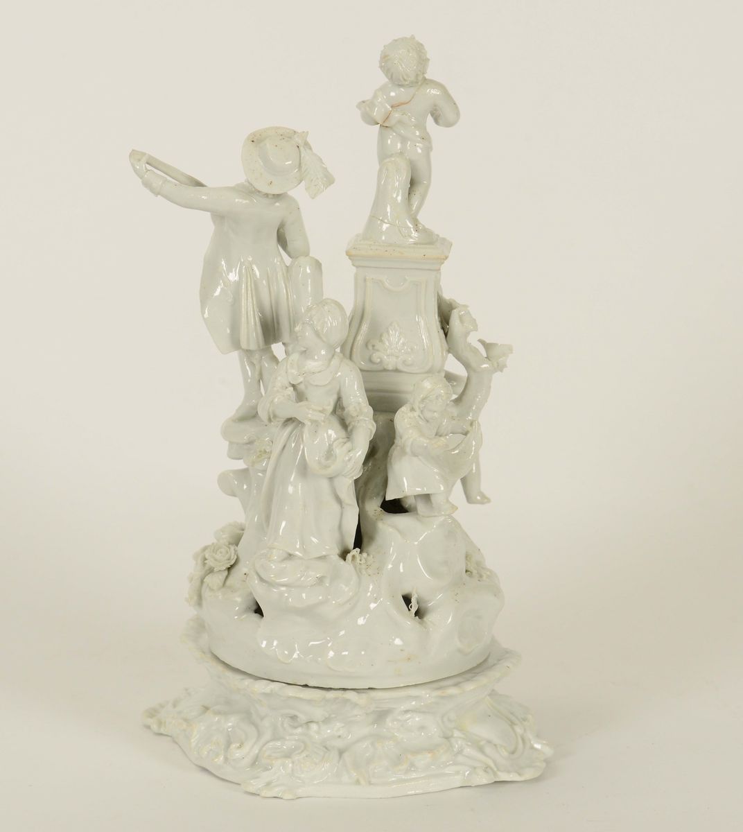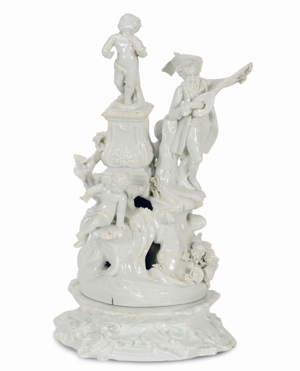 Porcellana, altezza cm 24; diametro cm 16,5Felatura e minori mancanzeIl gruppo bianco con base a rocailles vegetali è composto da un giovane musicante con strumento a corde, tre putti, una bimba ed una giovane contadinella.