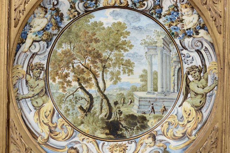 Maiolica a gran fuoco e dettagli in oro a terzo fuoco, diametro cm 28,0 Buono stato di conservazioneCorpo circolare, tesa lievemente rilevata, piede ad anello.Cornice coeva in legno dorato.Al centro del cavetto è raffigurato un paesaggio fantastico a vari piani di scena. In primo piano alcuni alberi dal fusto ricurvo, architetture classiche con piccole figure intorno. In lontananza una città a ridosso di una montagna. La tesa è dipinta con elementi architettonici, mascheroni, putti e fauni alati. Paesaggista di grande talento, in questo piatto C. A. Grue si rivela di abile traduttore di elementi complementari attorno al paesaggio, tratti da fonti incisorie del tempo. in questo piatto C. A. Grue rivela la sua grande abilità anche di vedutista.