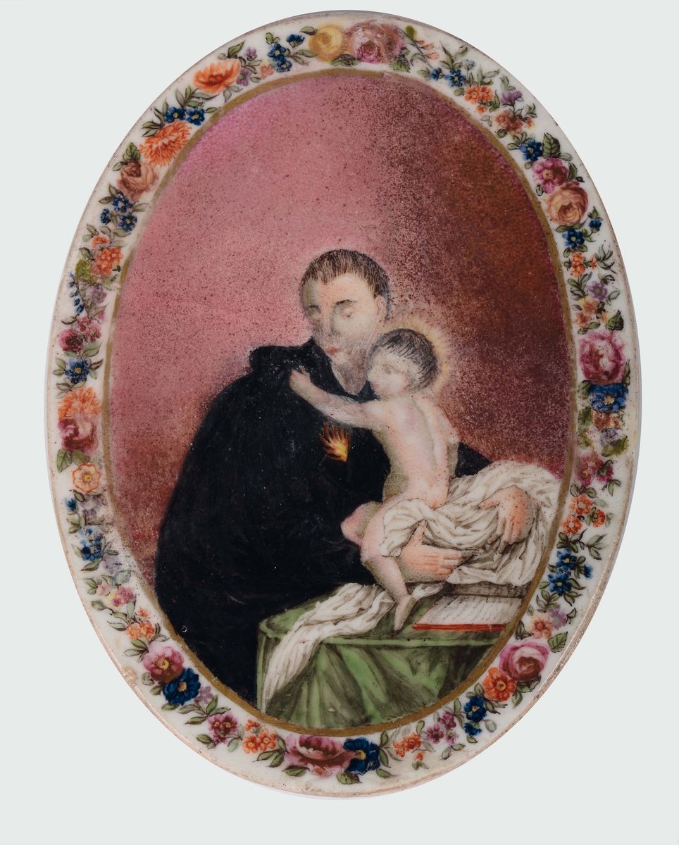 Porcellana, altezza cm 10,5RestauriDipinta sui due lati con San Girolamo con i suoi attributi e sull’altro lato con Sant’Antonio. Sul bordo ghirlanda di foglie e fiori.