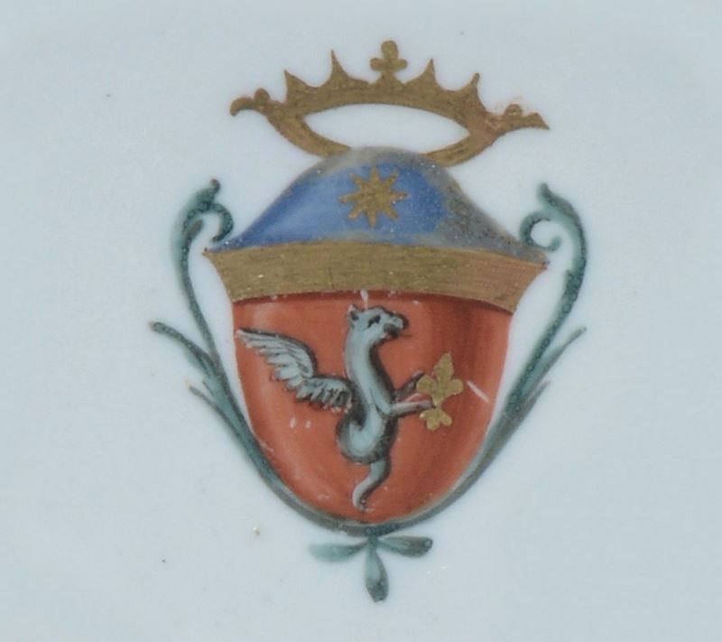 Porcellana, Marca: stella in rosso, piattino: diametro cm 11,6, tazzina: altezza cm 4,2Lieve felaturaSulla parete esterna della tazza e nel cavetto del piattino è dipinto uno stemma araldico coronato policromo e oro.