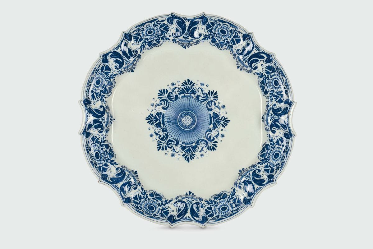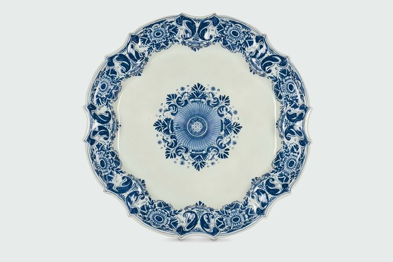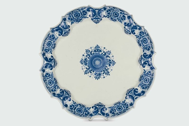 Maiolica a gran fuoco in monocromia blu, diametro cm 45,0; cm 51,5; cm 56,5 Buono stato di conservazioneCorpo circolare bordo orlato mistilineo, tesa leggermente costolata. Base piana.Decoro tipo Delft o all’olandese (detto anche “ad occhio di bue”), composto da grandi fiori e foglie fortemente stilizzati disposti radialmente lungo il bordo. Al centro motivo a corolla stellata con fo- glie stilizzate.