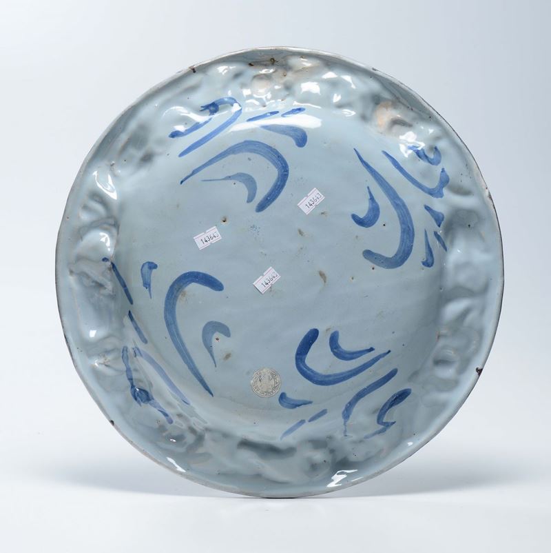 Maiolica a gran fuoco, dimensione cm 38,0 Buono stato di conservazioneCorpo ovoidale su fondo piano, tesa a rilievo con fiori e foglie.All’interno di un medaglione centrale è raffigurato un paesaggio con edificio. All’orizzonte alcune montagne. La tesa è dipinta in bruno di manganese, mentre i fiori, a smalto bianco, sono decorati con fini tratti in bruno e giallo.