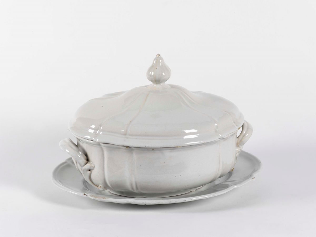 Maiolica a gran fuoco, vassoio cm 36,5x29,0; zuppiera: altezza cm 23,0; lunghezza cm 33,0; larghezza cm 23,0Felatura al ventre e lievi sbeccaturePresentatoio: corpo ovale, bordo sagomato, fondo piatto.Zuppiera: corpo ovale, costolata, basso piede, prese a nastro, coperchio costolato e ribassato, presa cuspidale a forma di pigna.Superficie maiolicata priva di decorazione.
