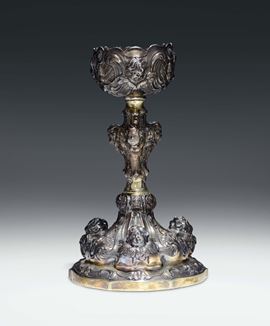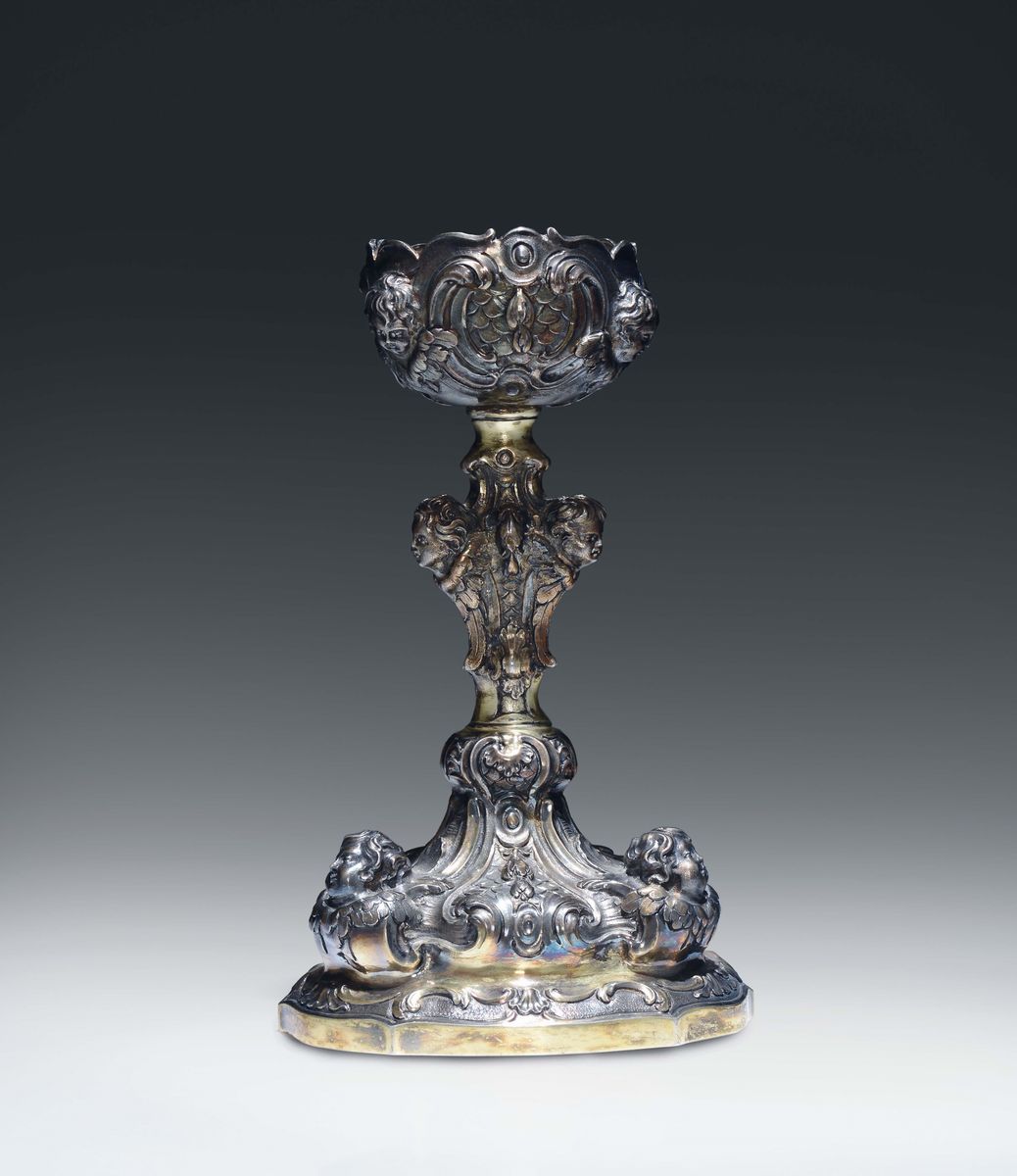 Base gradinata e sagomata con decori a volute e teste di cherubini aggettanti ripetuti sul nodo e nel sottocoppa.Altezza cm 20, gr. 420 circa (coppa mancante)