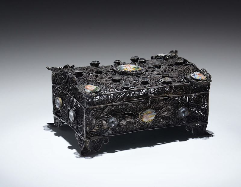 Cofanetto in filigrana lavorata a volute e incastonature in vetri colorati. Genova o Sicilia XVIII secolo